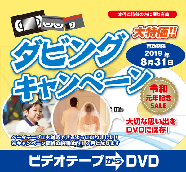 ダビングキャンペーン(8/31日まで) 大切な思い出をDVDに保存しましょう!ビデオテープ5本以上のご注文で「1本につき980円」です♪