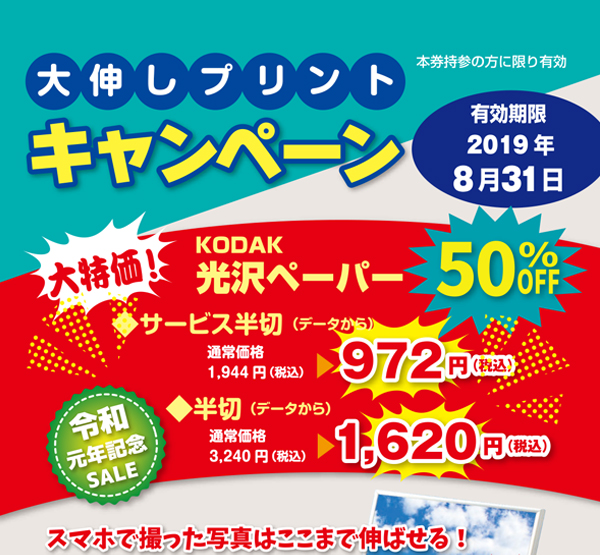 大伸ばしプリントキャンペーン(8/31日まで) スマホで撮った写真はここまで伸ばせる!Kodak光沢ペーパー 最大50%OFF 大特価!!